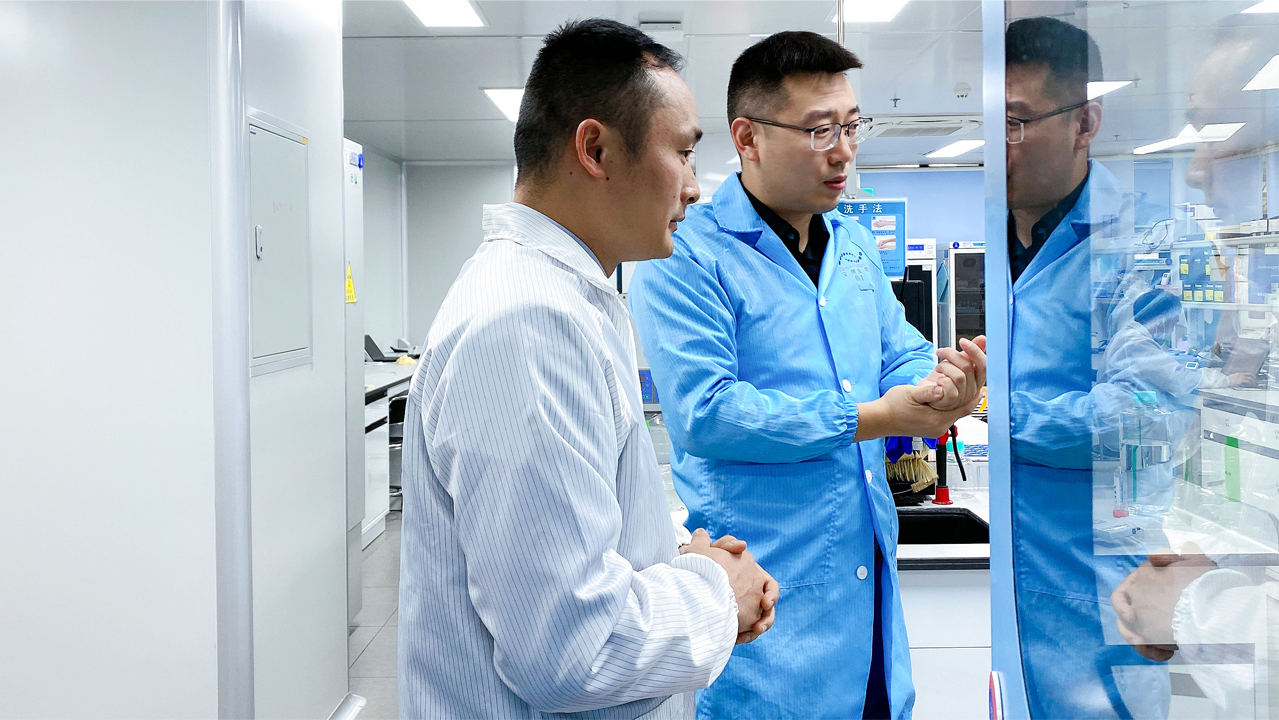 随后,沈潇博士与张光南教授一行参观了广州伯利恒研发基地,详细讲解了CMC开发的各类平台。其中,沈潇博士特别提到IgM平台(IgMaxTM表达载体平台和IgMasterTM工艺平台),我们很早就布局搭建了这个平台,去年遇到客户需求,我们便能迅速反应,并将产量做到了业界最高——8g/L(大部分文献中IgM产量是低于1g/L)。张光南教授对汉腾生物的创新发展表示肯定,并对沈潇博士在粤港澳大湾区生物医药领域所作的努力表示高度的赞扬。
